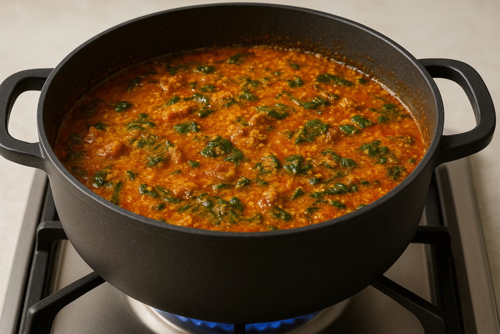 - Vegetables like spinach, ugu, or bitterleaf should be added towards the end to preserve color and nutrients.