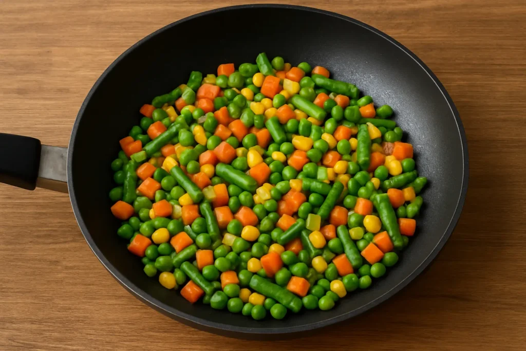 Add the carrots first because they take the longest to soften. After a minute, add the peas, green beans, and sweet corn. Fry them gently on medium heat. The aim is not to overcook them; your vegetables should remain fresh, crunchy, and bright. Soft or soggy vegetables will spoil the texture of your fried rice.