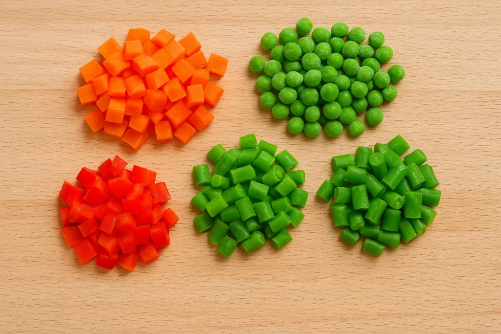 Mixed vegetables: Carrots, green peas, sweet corn, and green beans. These add color and taste.